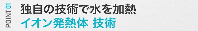 - 電極イオン発熱体技術:水だけに反応し、水を素早く温める最大90〜100度以内