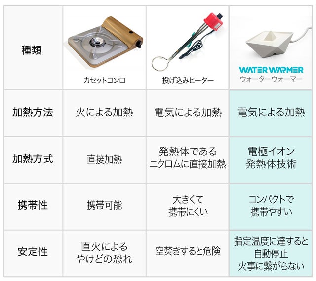 - 携帯性・安定性:コンパクトで水だけに反応するので、空焚きでも火事にならない。