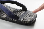 取り付けられている花緒は、前坪(指ではさむ部分)と裏地(足に接する部分)に上質な肌触りの起毛スエード生地を使用することで、通常の雪駄の花緒とは一線を画すやわらかな履き心地を実現し、さらに裏地と前坪部分の芯材にソフトなウレタンをプラスしたことで、足への負担をより減らすことに成功しました!
