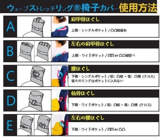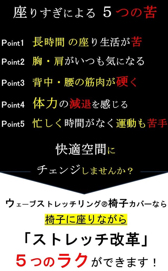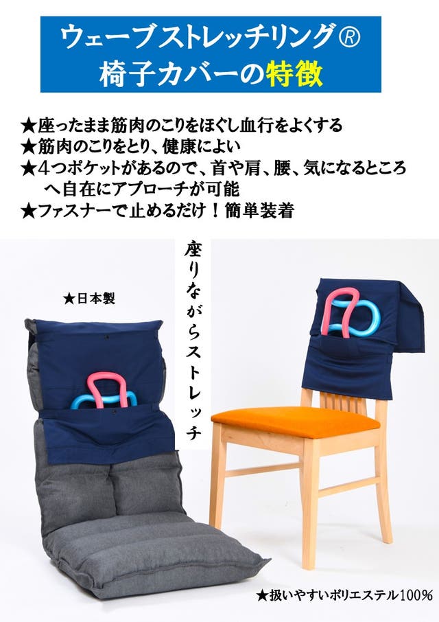 座りながらストレッチと筋肉のこりをほぐすことが同時にでき、血行をよくする、特許取得ウェーブストレッチリングを活用した椅子カバーがおススメ!