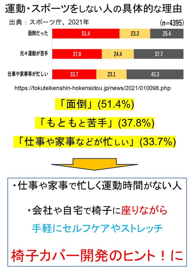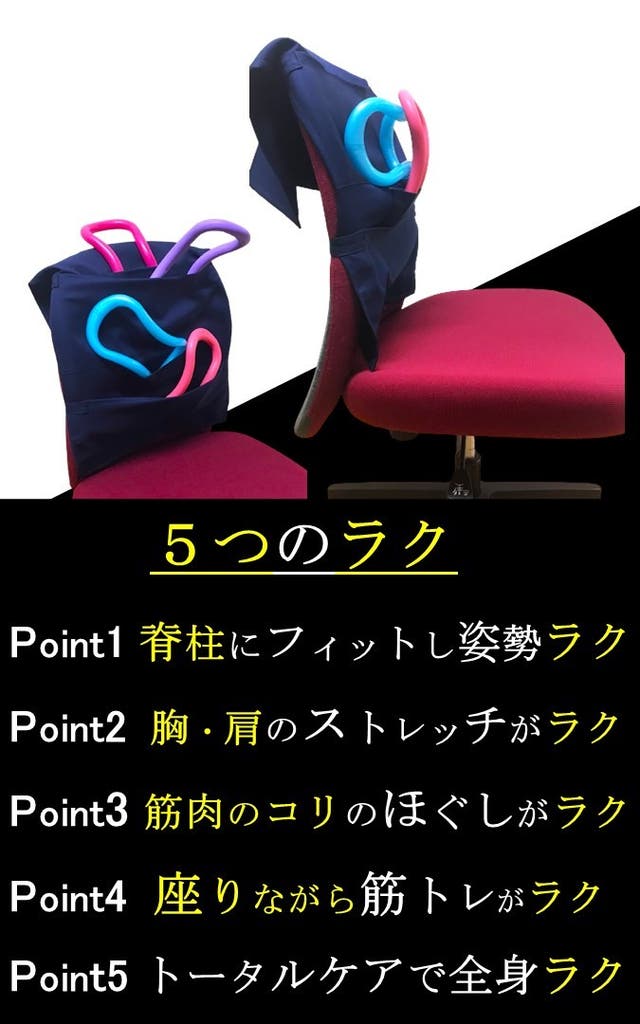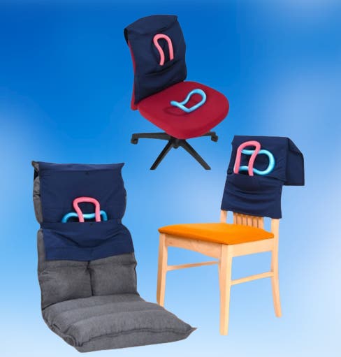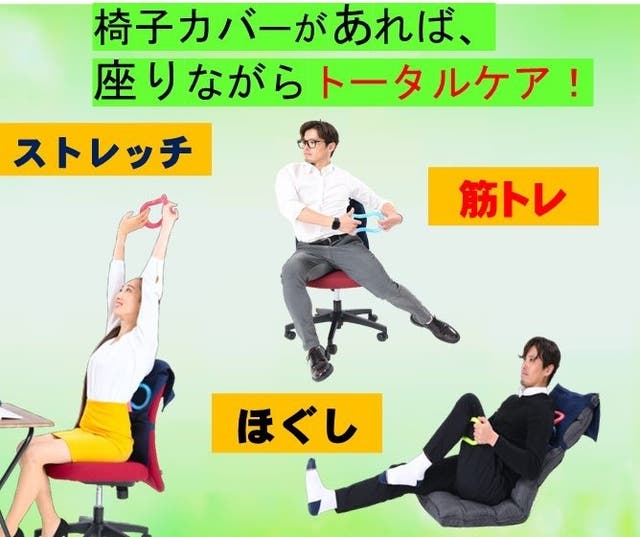 会社や自宅で椅子に座りながら手軽にセルフケアやストレッチなどが出来るように椅子カバーを開発した。
