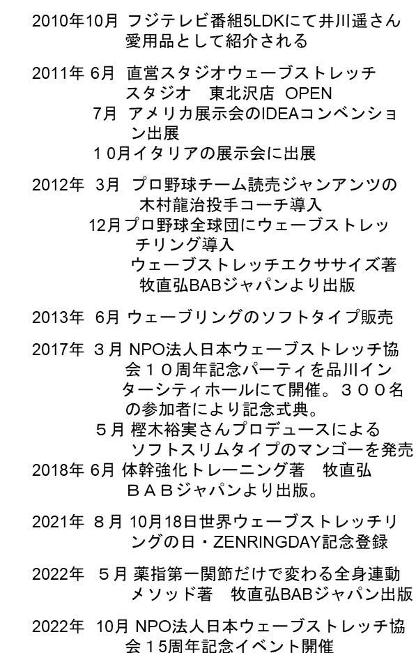 私が開発したウェーブストレッチリングは、2005年に発売し、今年で19年目でになります。多くの方の健康作りに貢献できるようにNPO日本ウェーブストレッチ協会を、2008年以立ち上げ、ウェーブストレッチリングの指導者育成活動を行っております。