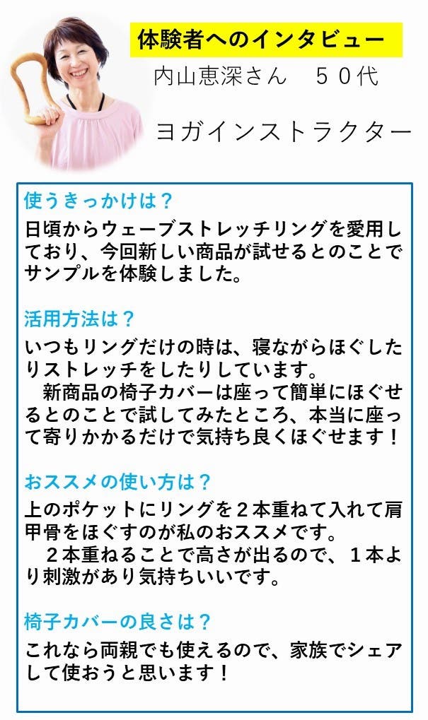 今回の椅子カバーは、特に健康経営など忙しく時間のない方にぜひ使って頂きたいです。さらに、この椅子カバーの様々なワークショップ、講習会を全国で開催していきます。ぜひ、応援よろしくお願いします。