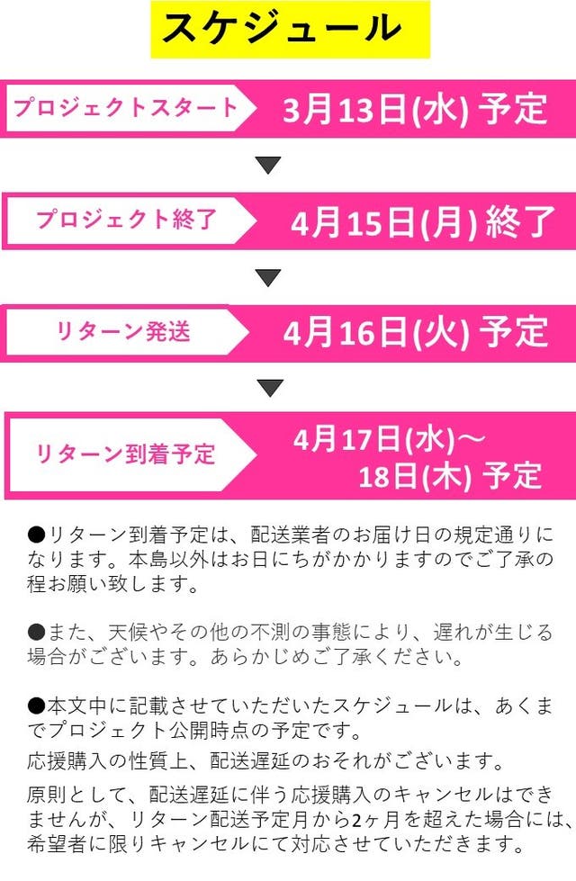 ※使用感等に関する返品・返金はお受けいたしかねます。 ※デザイン・仕様は予告なく一部変更になる可能性もございます。 ※ご注文状況、使用部材の供給状況、製造工程上の都合等により出荷時期が遅れる場合があります。 ※本プロジェクトの実施において十分確認は行なっておりますが、類似品が発覚する可能性がある点、ご了承願います。 ※一部国内に類似商品が出回っている場合がございます。弊社では他社の類似品に関してのお問い合わせには対応できませんのでご了承ください。 ※本文中に記載させていただいたスケジュールは、あくまでプロジェクト公開時点の予定です。応援購入の性質上、配送遅延のおそれがございます。 ※原則として、配送遅延に伴う応援購入のキャンセルはできませんが、リターン配送予定月から3ヶ月を超えた場合には、希望者に限りキャンセルにて対応させていただきます。 応援購入の性質上、以上の注意点につきまして予めご理解とご了承頂いた上で、ご購入くださいます様よろしくお願い申し上げます。