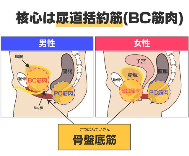 下部の「尿道括約筋」と「肛門括約筋」などを同時に刺激してこそ、骨盤底筋全体を刺激出来ます。