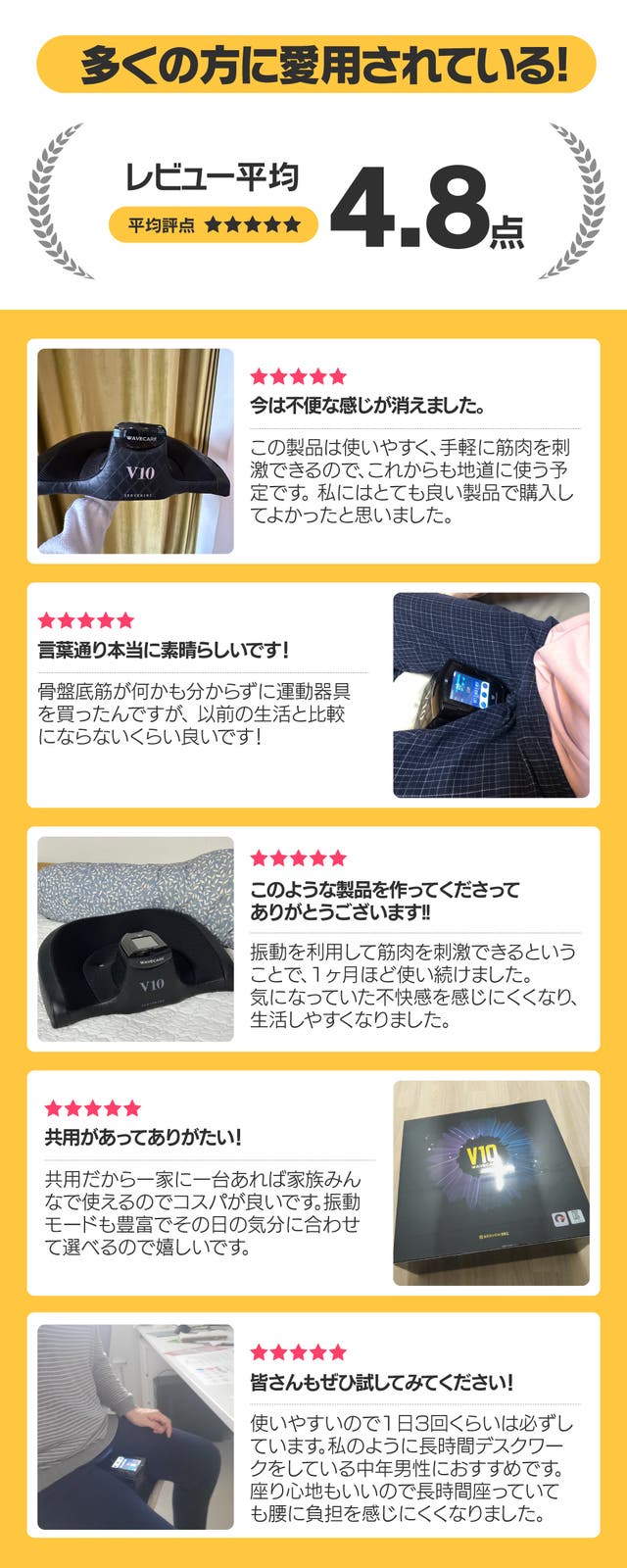 この商品を輸入しようと思った理由:長時間デスクワークのため、正しい姿勢を保ち腰に負担をかけないように下半身のトレーニングを始めようとしました。しかし、自力でするには継続することが難しく、時間にも体にも負担がかからない運動器具はないかと思っていたところ、このV10に出会いました。私のように鍛えたい方々がたくさんいるのではないかと思い、、プロジェクトを行うこととなりました。
