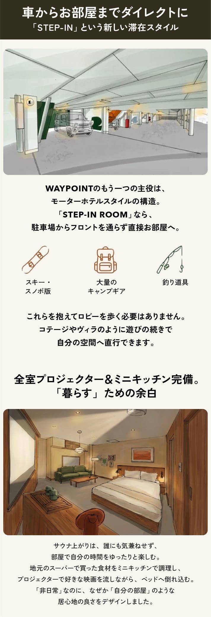 - 全室プロジェクターとミニキッチン完備の客室で、 余韻を壊さず自分達の時間に没入!