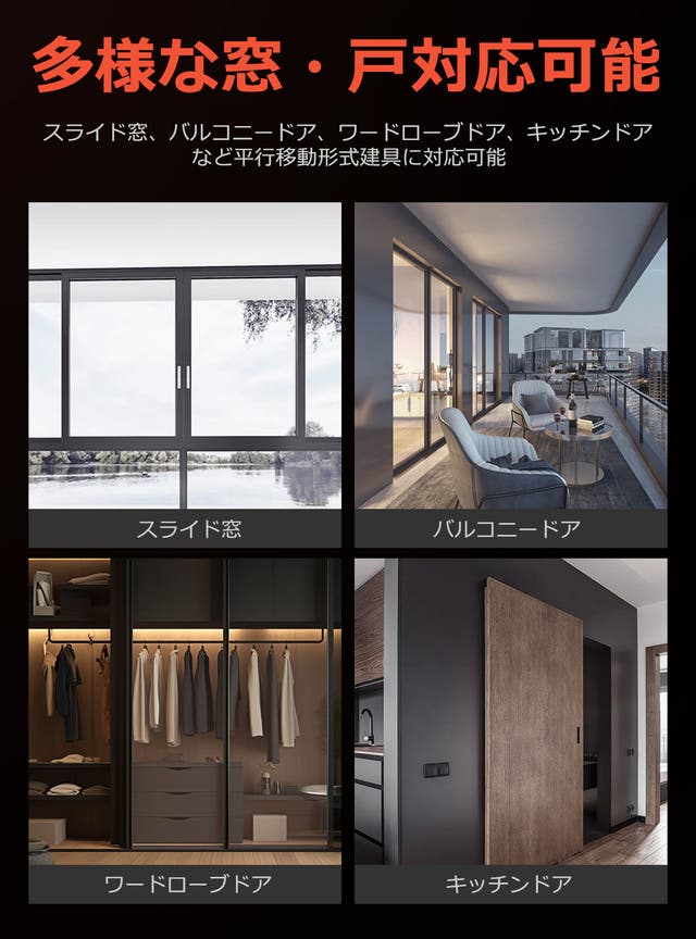 多くの種類の左右にスライドする窓やドアに適応可能です。例えば、スライド窓、バルコニーの引き戸、和室の襖、キッチンの引き戸など、さまざまなタイプの窓やドアに対応できます。