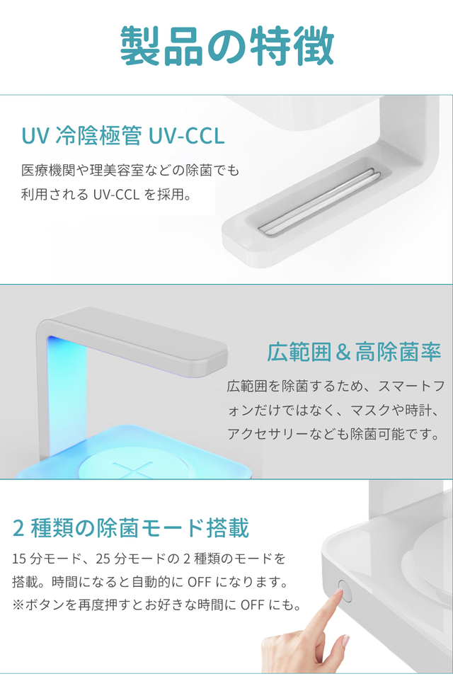 - たった15分!除菌しながらスマートフォンをワイヤレス充電!