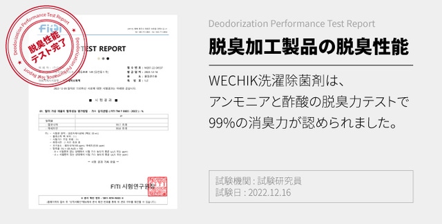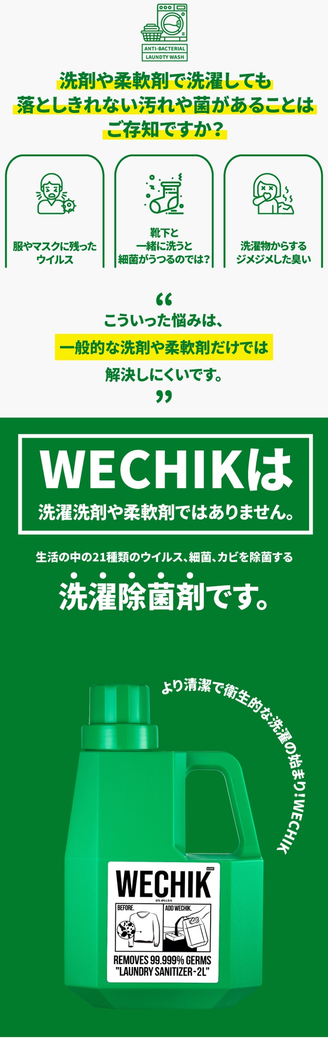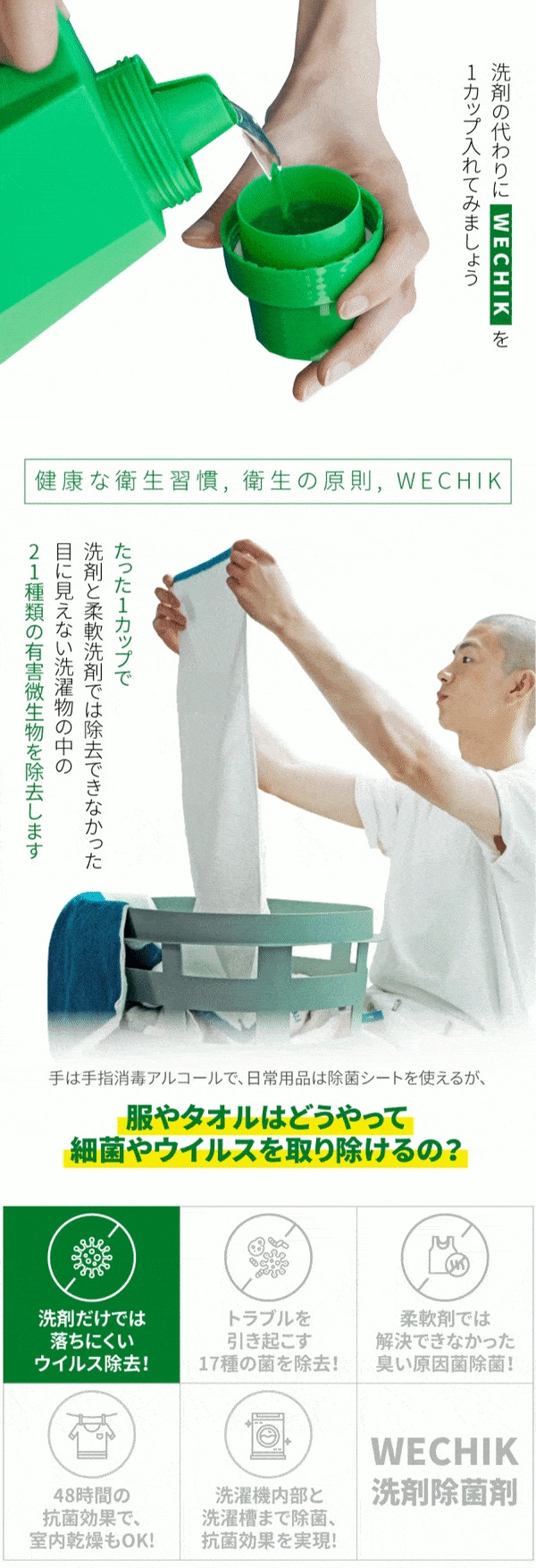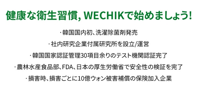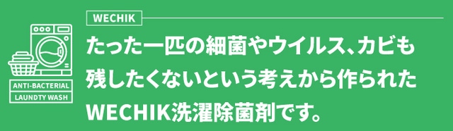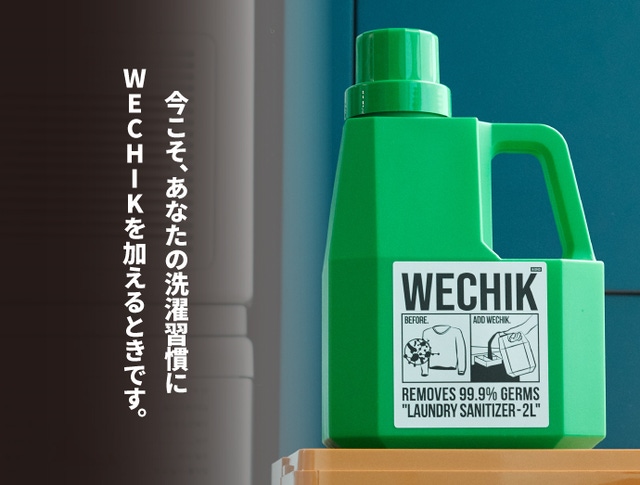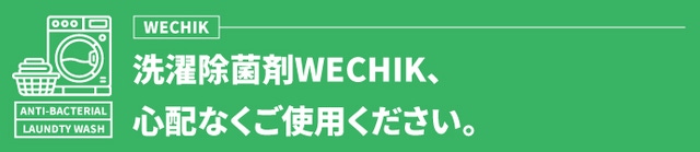 ※ WECHIKは洗濯時に有害細菌、ウイルス、カビを除去する除菌剤です。一回の使用で一生の除菌力を提供するものではありません。