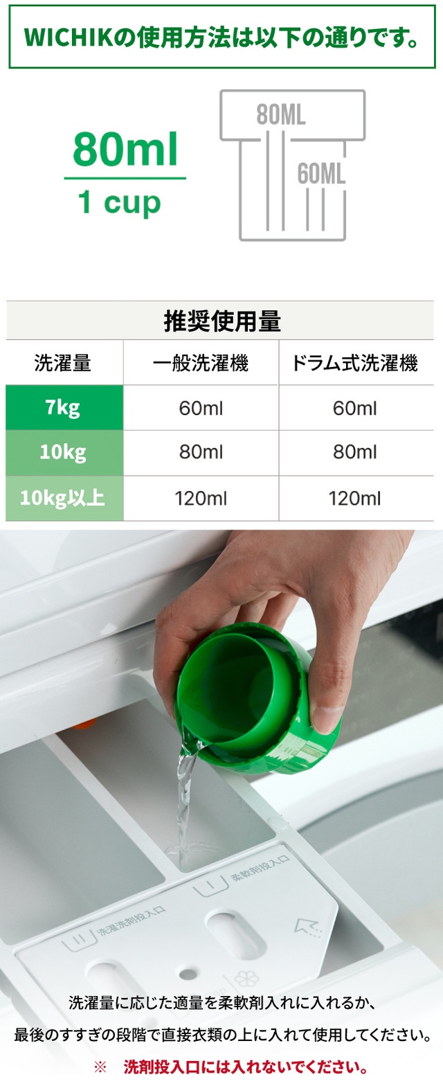 ※本製品を洗剤投入口に洗剤と一緒に入れた場合、洗剤とWechikの効果が両方失われます。必ず洗剤と別々に使用してください。