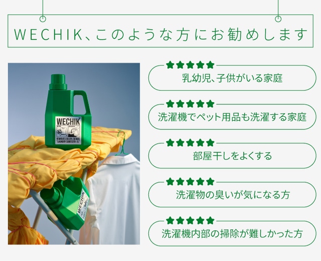 A. WECHIKは洗濯機に入れて使用する洗剤で、洗濯コースを進める際に水と十分なすすぎの過程を経るため、洗濯後に除菌成分による刺激の心配から自由です。