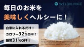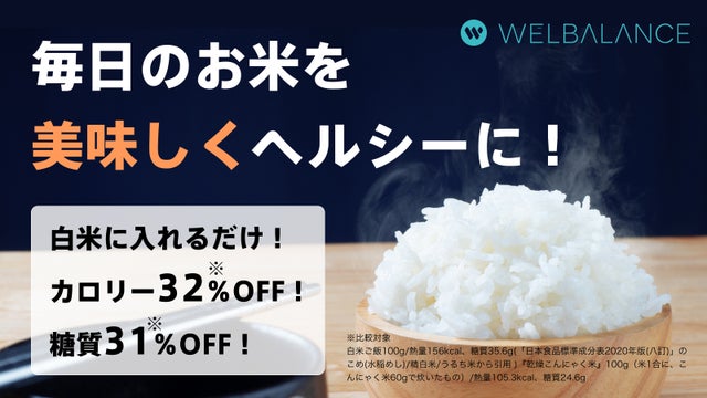 ごはん100gのカロリーは156kcal、糖質は35.6gと言われていますが、WELBALANCEの『乾燥こんにゃく米』は、カロリー約32%、糖質約31%OFF!!(※)