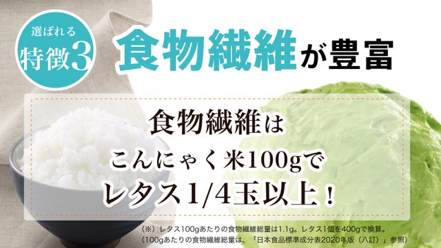 ダイエットの味方でもある食物繊維はこんにゃく米100gでレタス約1/4個分以上も含まれているんです!(※)