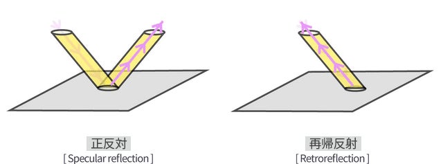 A3) フラッシュボールのPU反射革は再帰反射性質を持つためです。 光が入ると鏡のように反対方向に反射する「正反射」とは異なり、再帰反射は入射した光を光が出発した光源にそのまま戻す反射です。