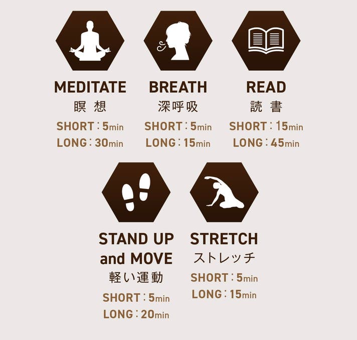 A2. アクティビティの種類は読書、ストレッチ、瞑想、深呼吸、軽いストレッチの5つで固定されており、変えることはできません。