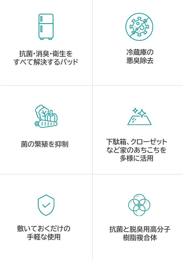 - 冷蔵庫の臭い、菌の繁殖を抑制 ! 敷いておくだけの手軽な使用 !