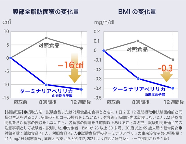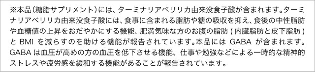 【届出表示】本品には、ターミナリアベリリカ由来没食子酸が含まれます。ターミナリアベリリカ由来没食子酸には、食事に含まれる脂肪や糖の吸収を抑え、食後の中性脂肪や血糖値の上昇をおだやかにする機能、肥満気味な方のお腹の脂肪(内臓脂肪と皮下脂肪)と BMIを減らすのを助ける機能が報告されています。本品にはGABAが含まれます。GABAは血圧が高めの方の血圧を低下させる機能、仕事や勉強などによる一時的な精神的ストレスや疲労感を緩和する機能があることが報告されています。