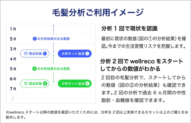 A:1回目の分析は、商品到着後7日以内に分析キットで毛髪をお送りすることをお勧めします。ただ、今回makuakeから応援購入された方の特典として分析キット使用の期限を無くしました。ご自分のタイミングでお送りいただいてもかまいません。なお、分析キットが2個以上の場合は2回の分析が可能です。2回目の分析は1回目から約3ヵ月後(90日後)がおすすめです。