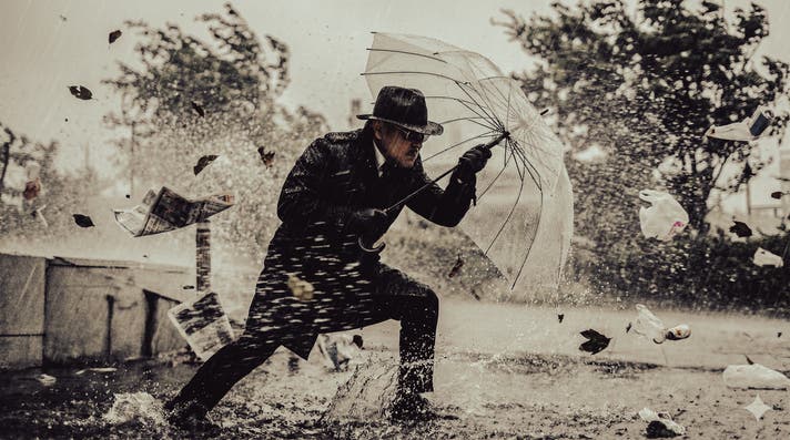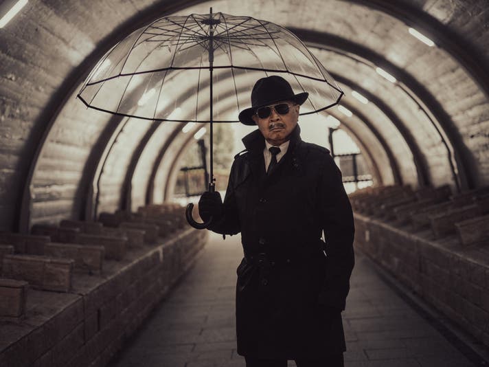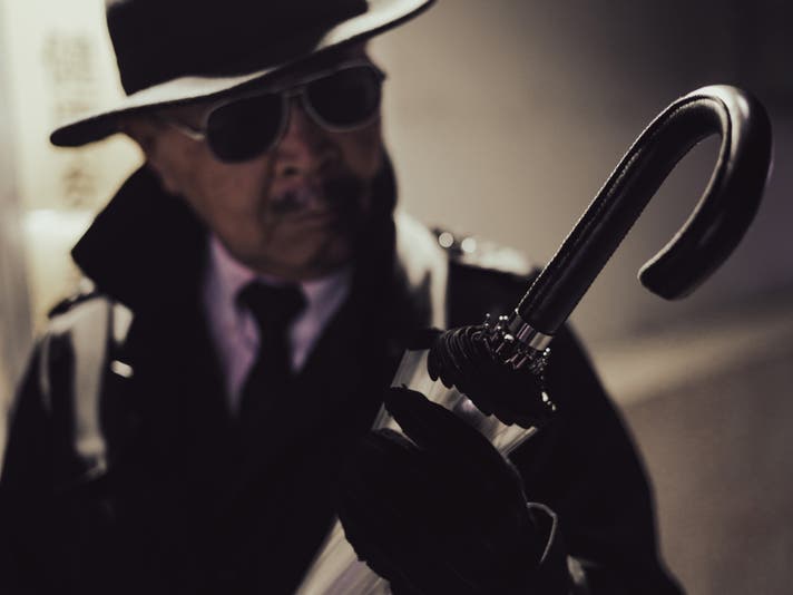劇中のエージェントに扮する私が自ら強風に挑んでおります(一般のビニール傘との比較もあり)