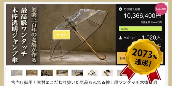 「Makuake(マクアケ)」は、実行者の想いを応援購入によって実現するアタラシイものやサービスのプラットフォームです。このページは、 プロダクトカテゴリの 「宮内庁御用!男のロマンを擽る究極の相棒!高級紳士用ワンタッチ透明ジャンプ傘!」プロジェクト詳細ページです。