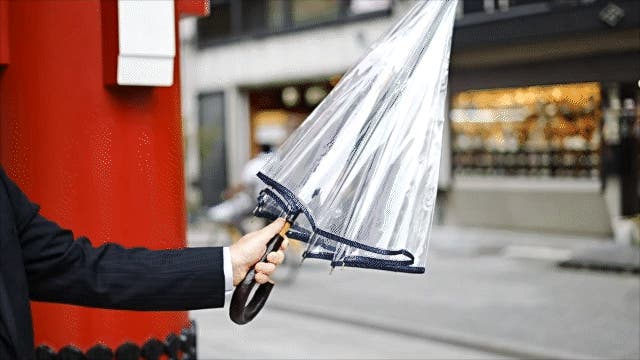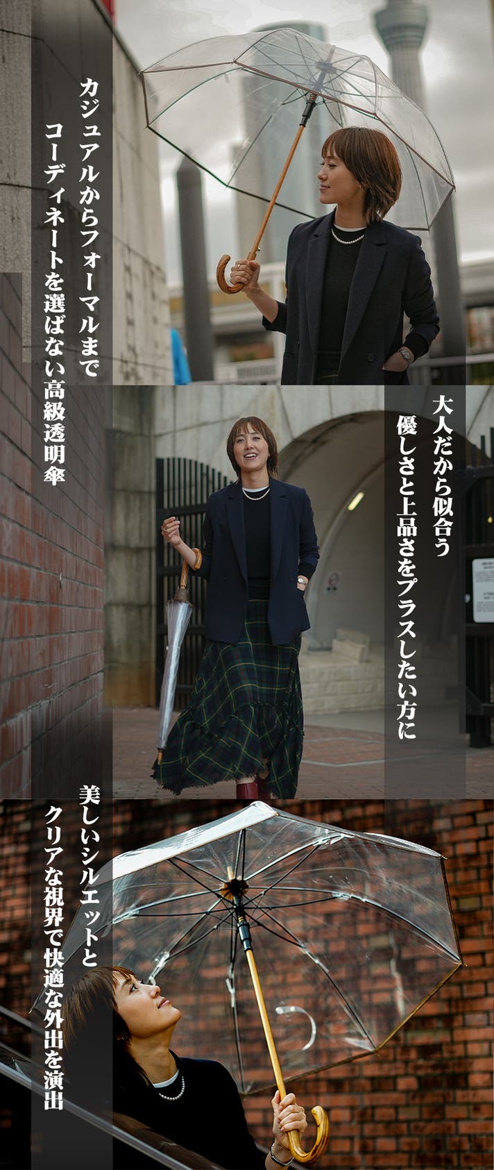 晴れの日と同じように360度周囲が見渡せる前がよく見える透明傘に極めてこだわっています。視界の悪い雨の日にカーテンを目の前にぶら下げて歩くような外出は危険です。飛び出す自転車や擦れ違う人、ベビーカーの赤ちゃん、雨天でも広い範囲を見極めて確認できる、一般のビニール傘と別次元で透明度が高くクリアな視界を実現しました!(オレフィン系多層フィルム使用)