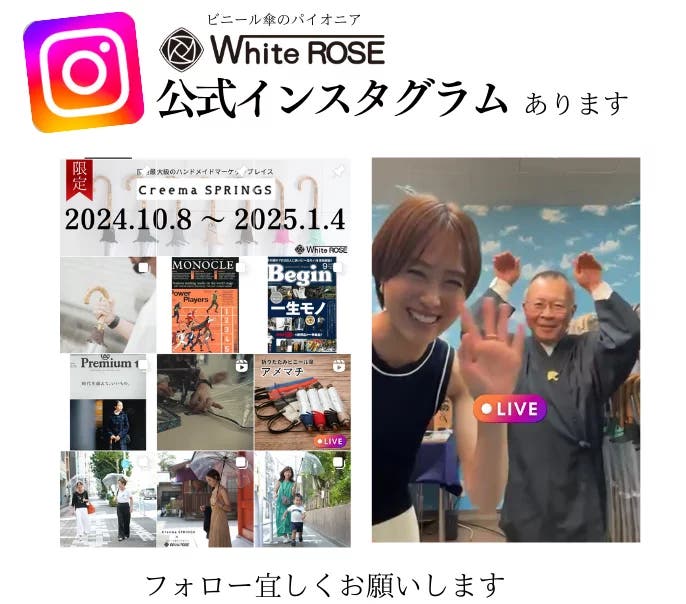 ホワイトローズは、国産ビニール傘を現在も守り続ける老舗メーカーです。日本国内(千葉県旭市)で熟練の職人が一本ずつ丁寧に仕上げております。手に取って頂ければ分かる作りの良さと丈夫で長持ちする確かな傘づくりを目指しております。
