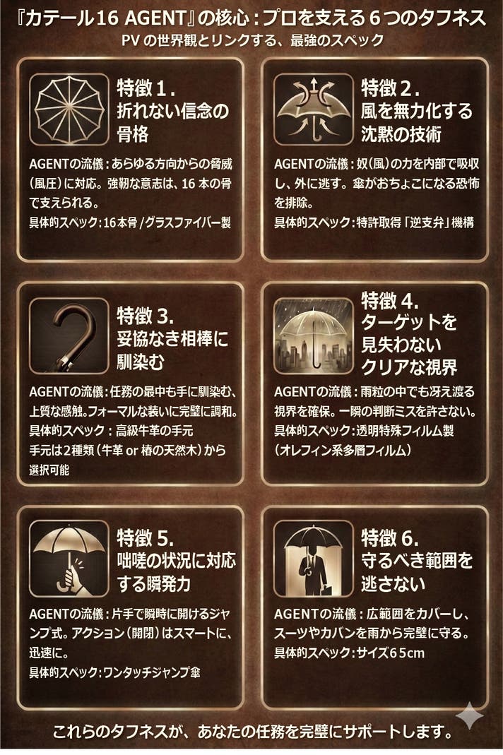激しい雨と風。傘の突然の故障は、ミッション(あなたの日常)の遂行を妨げ、致命的なリスクとなります。300年続く老舗ホワイトローズは、この「不完璧」を許しません。そこで誕生したのが今回のプロジェクト限定『カテール16 AGENT』です!