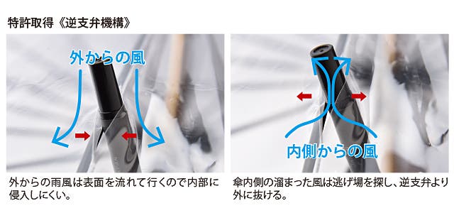 傘に「穴」をあけました!正確には特殊透明フィルムの重ね口が弁の役目をし、風の強い時に開閉して強風から傘と人を守る「逆支弁」が施されております。この技術により傘の内側からの風を吹き抜けさせて、外からの雨は入って来ない「逆支弁」が傘をおちょこ(ひっくり返る)になりにくくします。また、外からの風を受け流すことでより丈夫でタフな構造となっております。