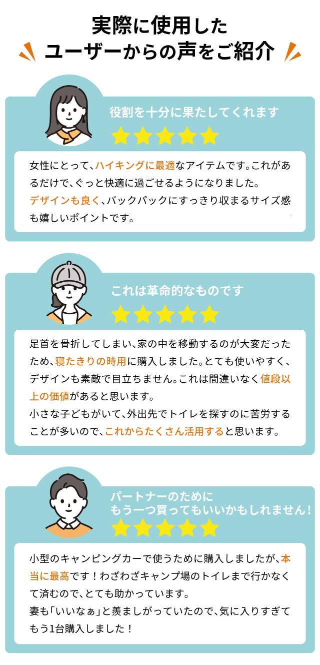 もともとは育児中の"外出先のトイレ問題"から生まれましたが、その機能性と信頼性が評価され、今では子供だけでなく、大人・高齢者・医療現場・トラックドライバー・現場作業員など様々な現場で選ばれる存在となっています。