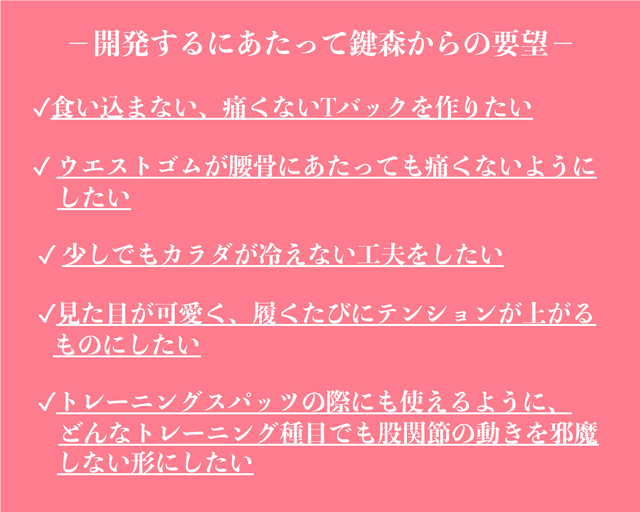 鍵森「そうか!痛くないやつ!しかもトレーニング中にも着心地がいいTバックを私が作るか!!」
