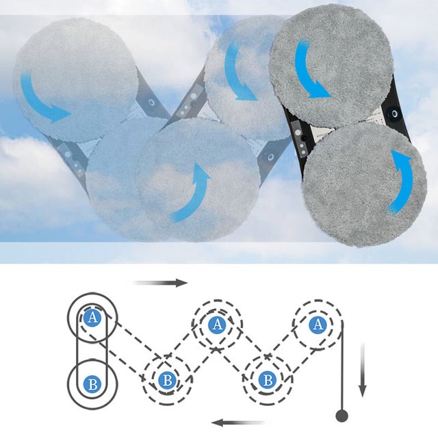 人の手がくるくる窓を拭いていくように、2つのクリーナーパッドが回転しながら窓を拭き上げていくのでガンコな汚れも一拭きで解決します。