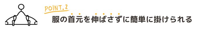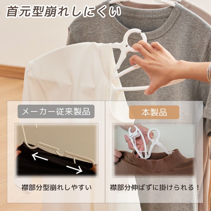 クリップ式ハンガーフックは肩の部分が可動式になっているため、衣服を掛ける際に襟元を無理に引っ張る必要がありません。襟ぐりが狭い服でも、簡単に掛けられます。