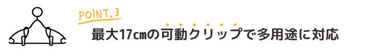 最大17cmまで調整可能な可動クリップは刻み目同士が噛み合うことで、しっかりと長さを固定できます。