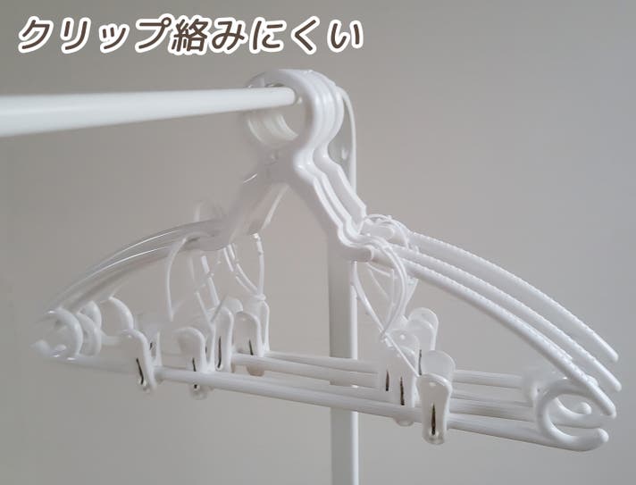 使用後はクリップをそのままハンガーに挟んで収納します。ハンガー同士が絡まりにくく、クリップの紛失の心配もありません。