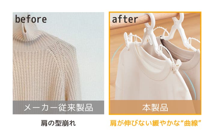 ハンガーの肩部分は肩のラインにフィットするカーブ仕様になっており、ニットやカーディガン、Tシャツなど肩ポコが出やすい衣類も型崩れを防ぎます。