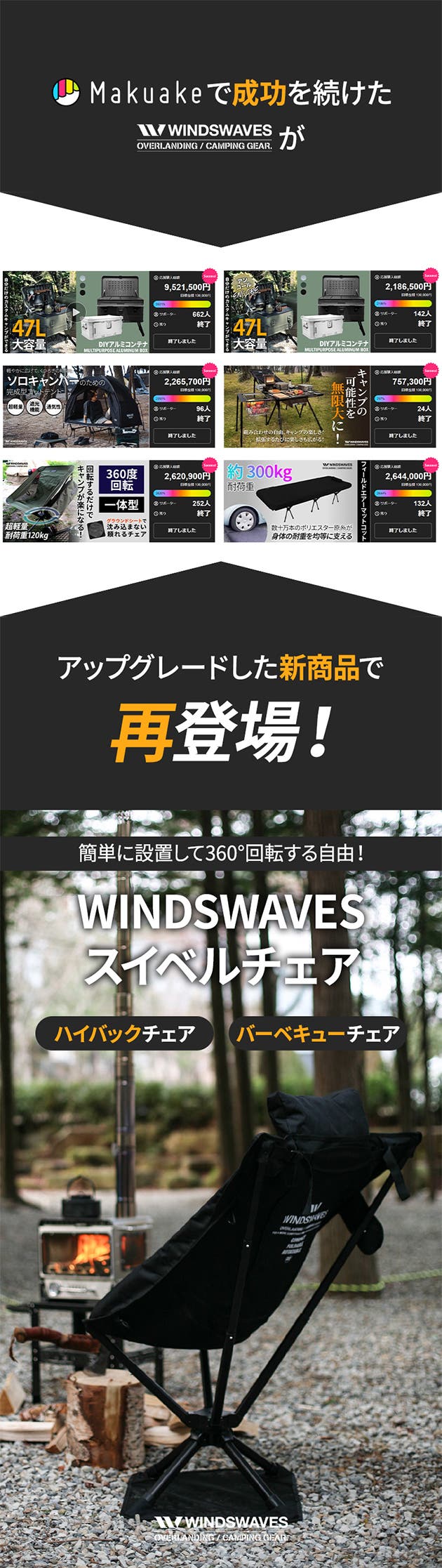 「Makuake(マクアケ)」は、実行者の想いを応援購入によって実現するアタラシイものやサービスのプラットフォームです。このページは、 プロダクトカテゴリの 「立ち座りのストレスを解消!10秒設置のキャンプ360°回転ハイバックチェア」プロジェクト詳細ページです。