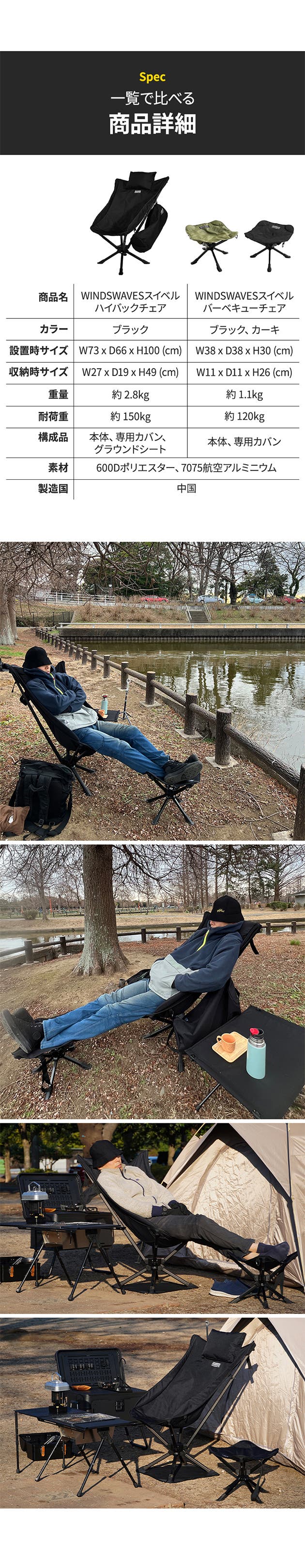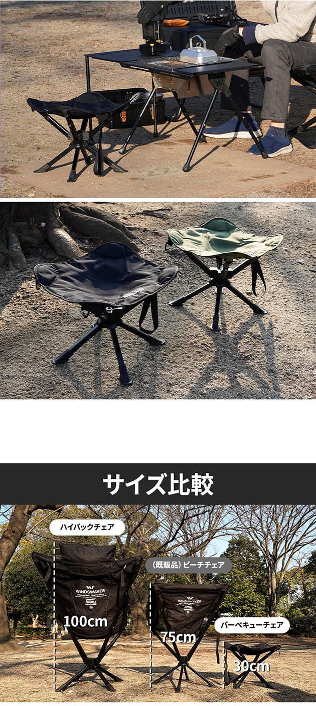 - 2つのサイズ!座り心地抜群のハイバックチェアとコンパクトだけど360度回転のバーベキューチェア