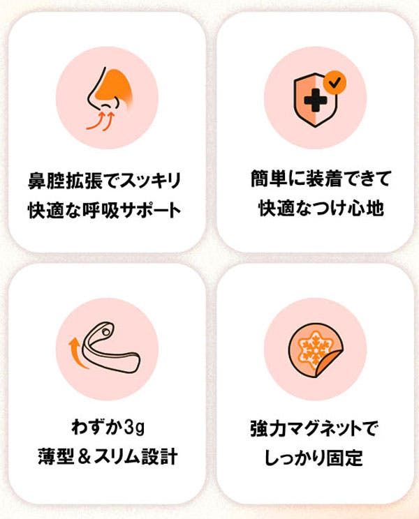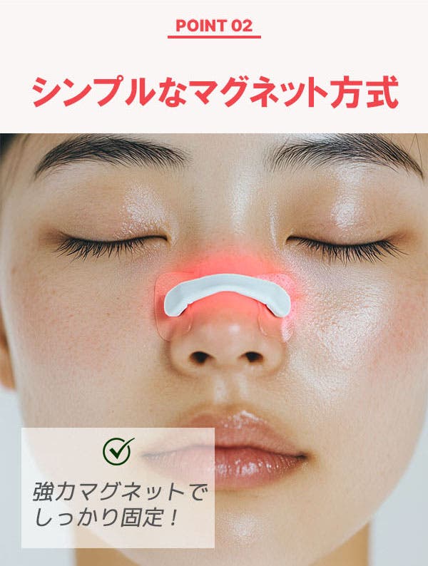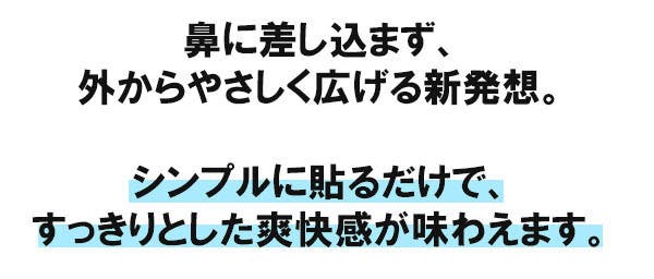 非挿入型・外付けマグネット方式で、自然なつけ心地です。スッと貼るだけで、すっきりとした爽快感で鼻の通りをスムーズにします。