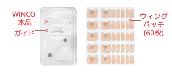 WINGCO本体 × 2個、ガイド × 1個、ウィングパッチ × 60枚