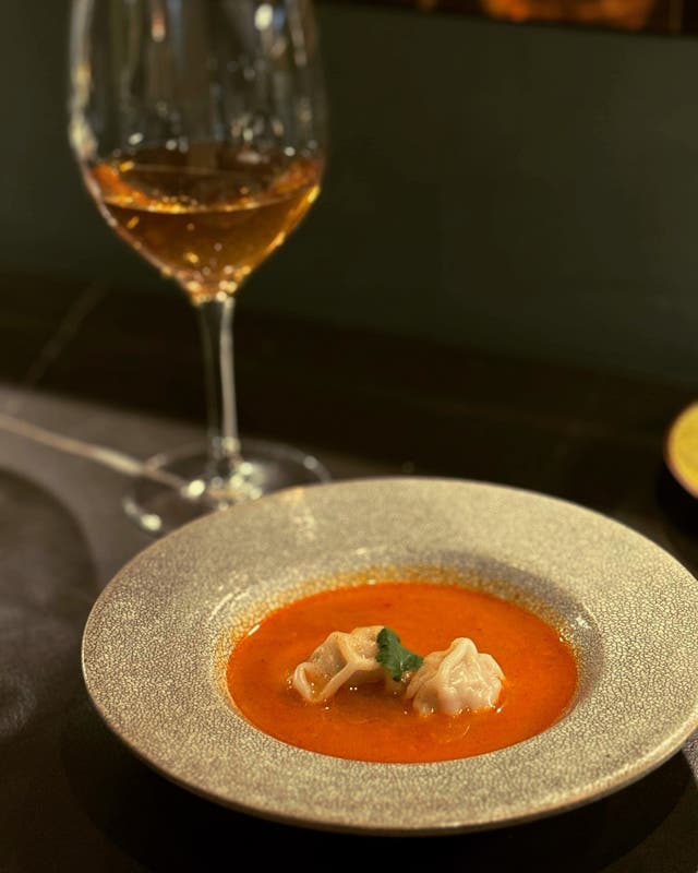 当店のスペシャリテで、おかわり続出のメニューはトムヤムスープの水餃子。みずみずしい酸味のあるナチュールオレンジワインとよく合います。