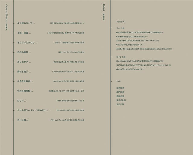 ※ペアリングドリンクが含まれます。ただし、追加でご注文頂くドリンクやお料理は別途料金が発生します