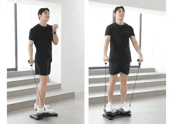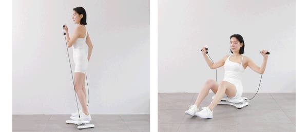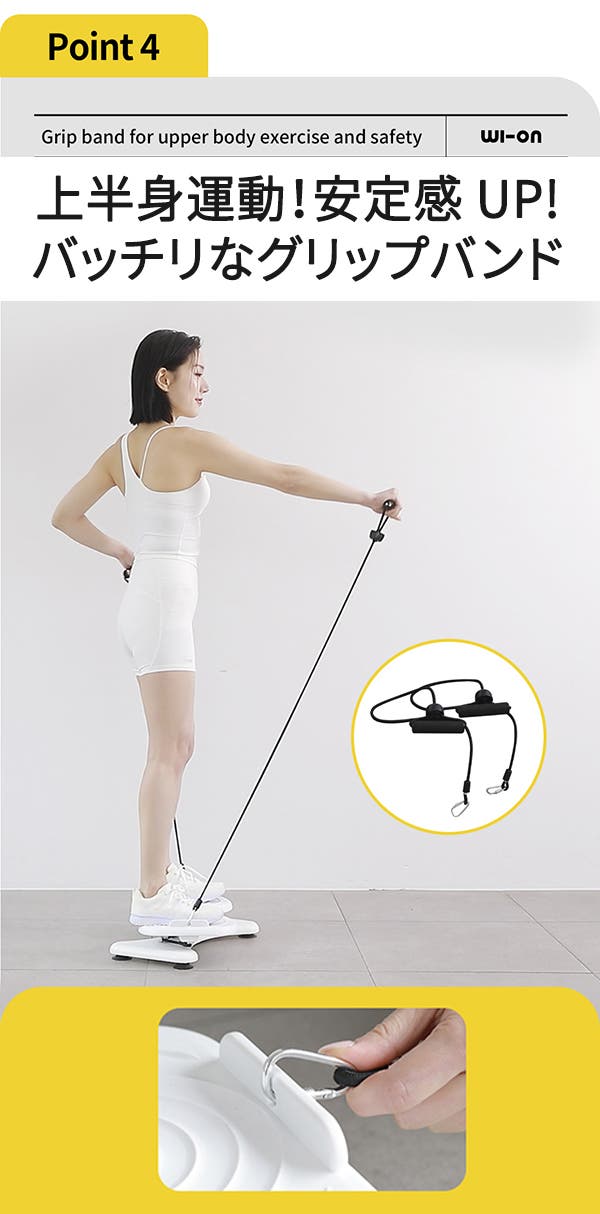 商品内付属の、グリップバンドを本体の両サイドフックにかければ、忘れがちな上半身や腕のトレーニングも同時進行!グリップバンドを持つことでツイスト運動がより安定的に行えます。