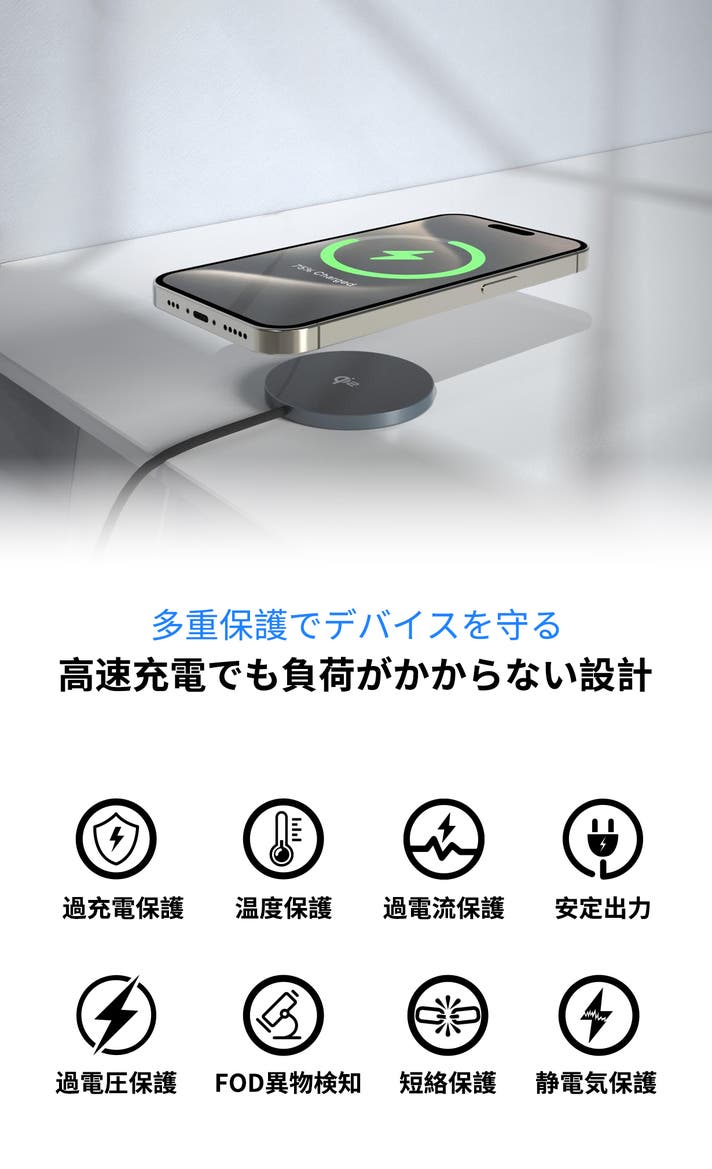 高速充電だけでなく、安全性にも徹底的にこだわりました。過充電保護、温度保護、過電流保護、過電圧保護、短絡(ショート)保護、静電気保護、さらにFOD(異物検出)機能まで搭載。