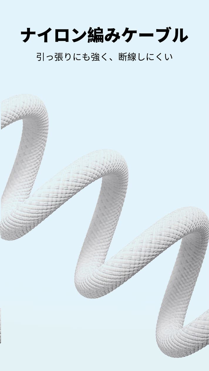 ケーブルには48本のナイロン編みを使用し、引っ張りにも強く、断線しにくい設計です。1メートルの長さは、どんな場所でも自由に使え、利便性も抜群。ケーブルの接続部分も強化され、長期間使用しても接続口が劣化しにくく、安定した充電を提供します。