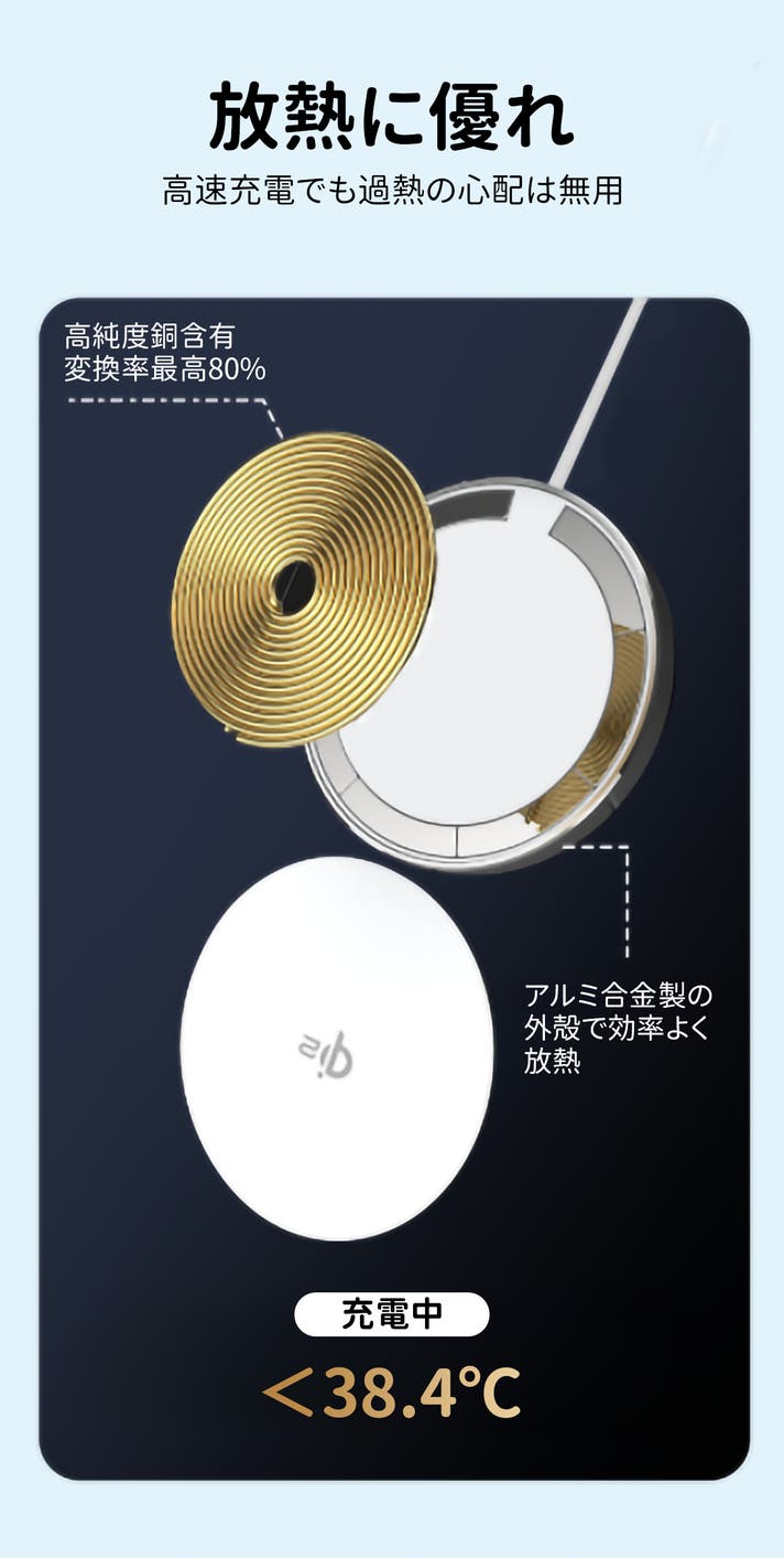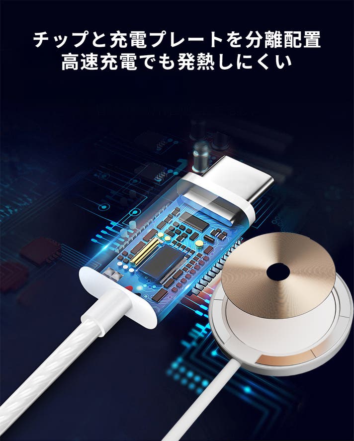 チップと充電プレートを分離配置することで発熱も分散!長時間の充電でも安定した温度を維持します。