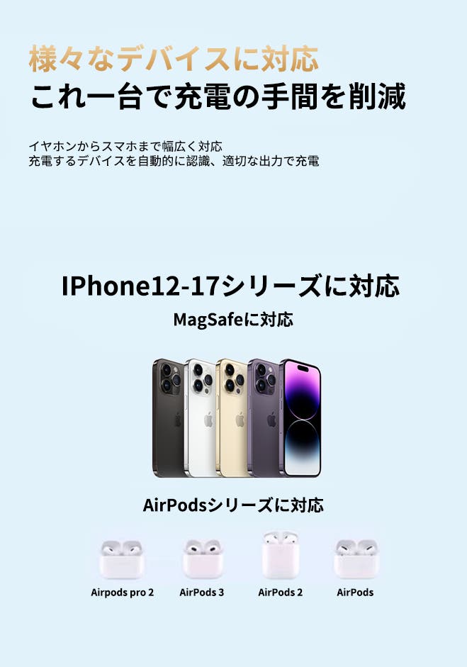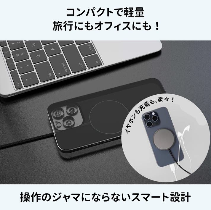 スマホはもちろん、Apple製ワイヤレスイヤホンにも対応しています。最大5Wの出力でAirPodsの急速充電をサポートし、イヤホンも簡単に充電できます。これ一台で、スマホとイヤホンの両方を快適に充電でき、充電の手間を大幅に削減。