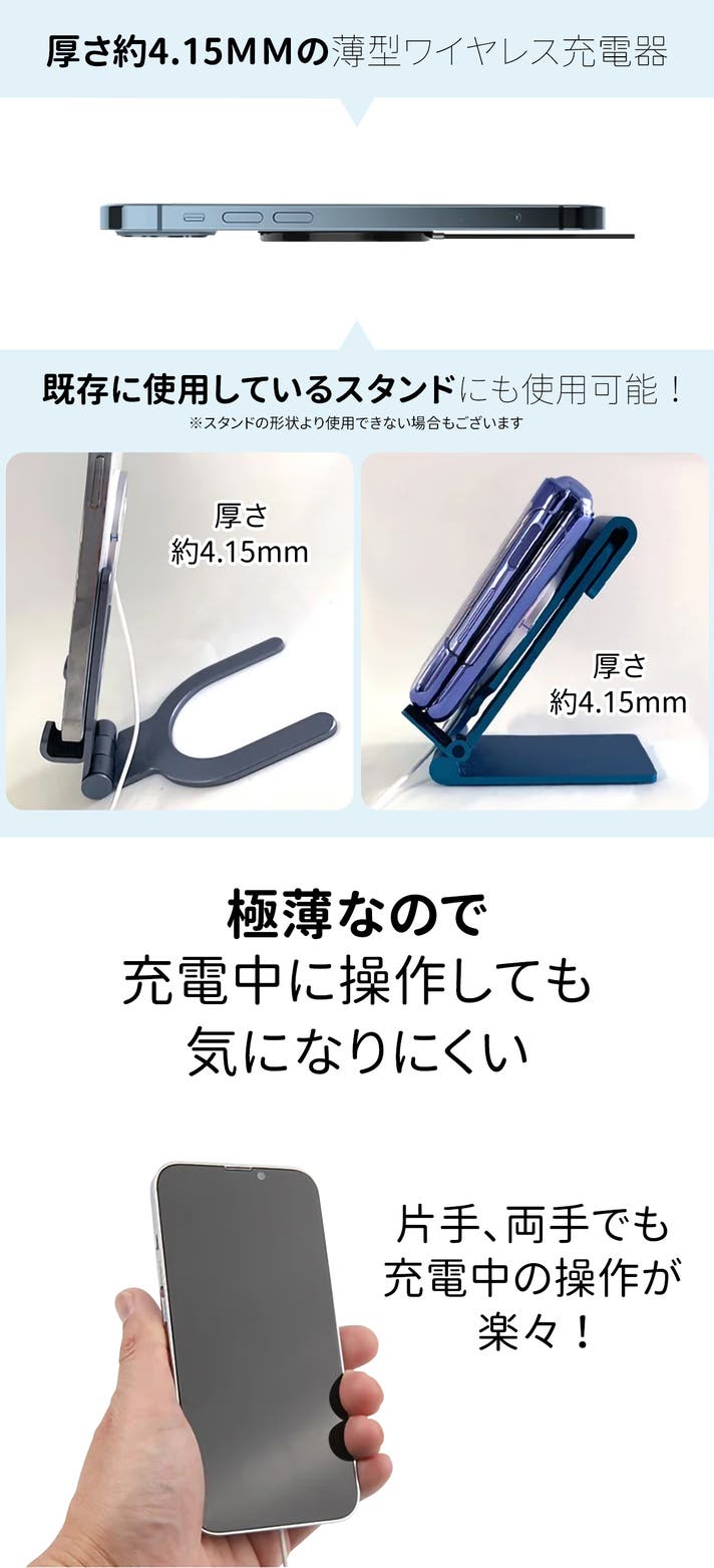革新的な回路最適化により、従来のワイヤレス充電器の常識を覆す薄さを実現します!充電チップを本体からType-Cコネクタ部分へ移動させることで、充電効率を一切犠牲にせず、本体の厚みを驚異のわずか4.15mmにまで削減しました!