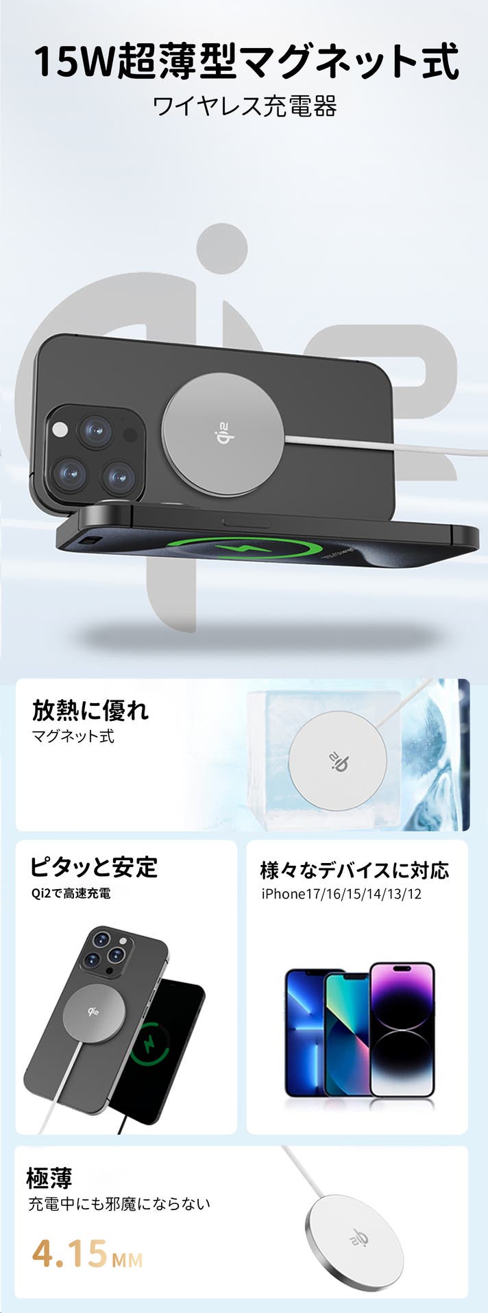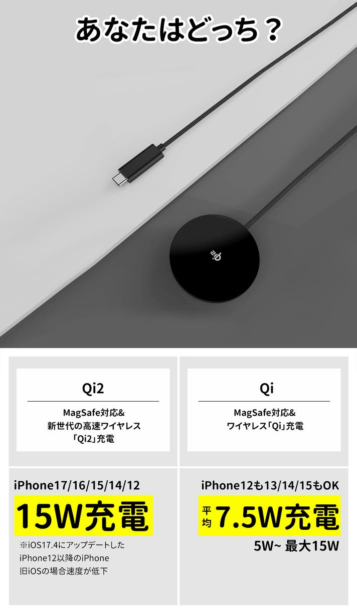 - Qi2対応で、最大15Wの高効率充電が可能。イヤホンなど小型デバイスにも幅広く対応