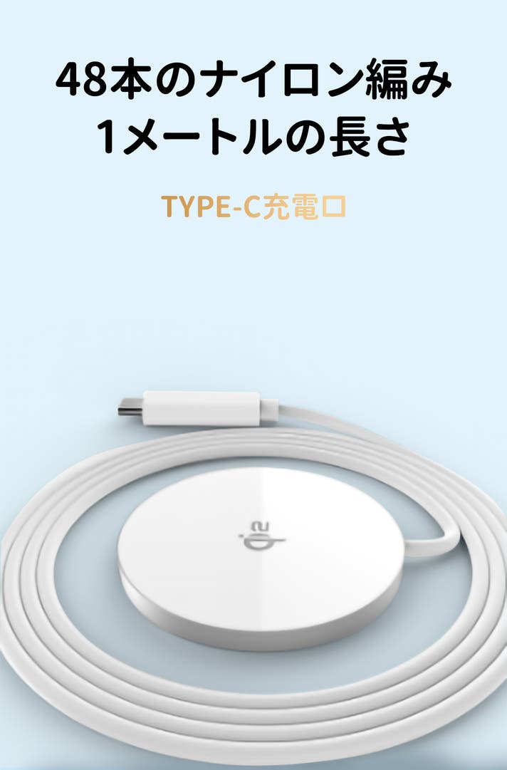 その結果、重量は約50g(ケーブル込み)、直径は約5.55cmになります。まるで存在を感じさせないほどの軽さと薄さで、スマホを持ちながらの充電を圧倒的に快適にします。しかも、その軽量設計により持ち運びも簡単。自宅やオフィスはもちろん、出張や旅行先でもストレスなく活躍します。